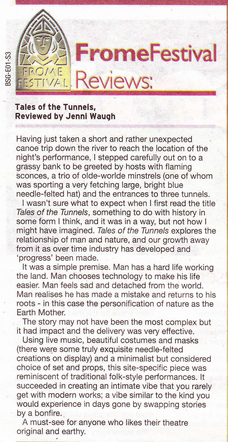 July 2018 : Frome Unzipped by Crysse Morrison pg. 60 (footnote 10) “...and the tradition of Medieval morality plays inspired an amazing drama produced by Andrew Shackleton and Bo Bowman-Shaw for the Frome Festival in 2013. “Tales of the Tunnels” blended social and environmental history with pagan deities, with music and dramatic visuals. For added impact the audience was transported under the vaults by boats….” |
